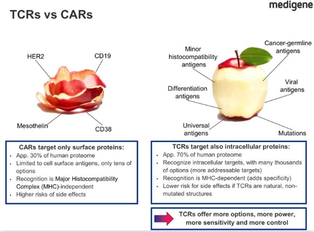 據(jù)雷博士介紹,CAR-T和TCR-T從整體的制備工藝到治療,途徑其實是一摸一樣的。包括從單采血到病毒載體/非病毒載體的改造,到后續(xù)的擴(kuò)增和回輸。其中最大的區(qū)別在于CAR-T療法所識別的靶抗原均為細(xì)胞表面蛋白,而胞外抗原僅占總抗原的10%,因此如何尋找適合的靶點成為困難所在。而TCR-T 療法能識別組織相容性復(fù)合(MHC)分子呈現(xiàn)的細(xì)胞內(nèi)的抗原片段,因此 TCR-T 療法具有更廣泛的靶點。