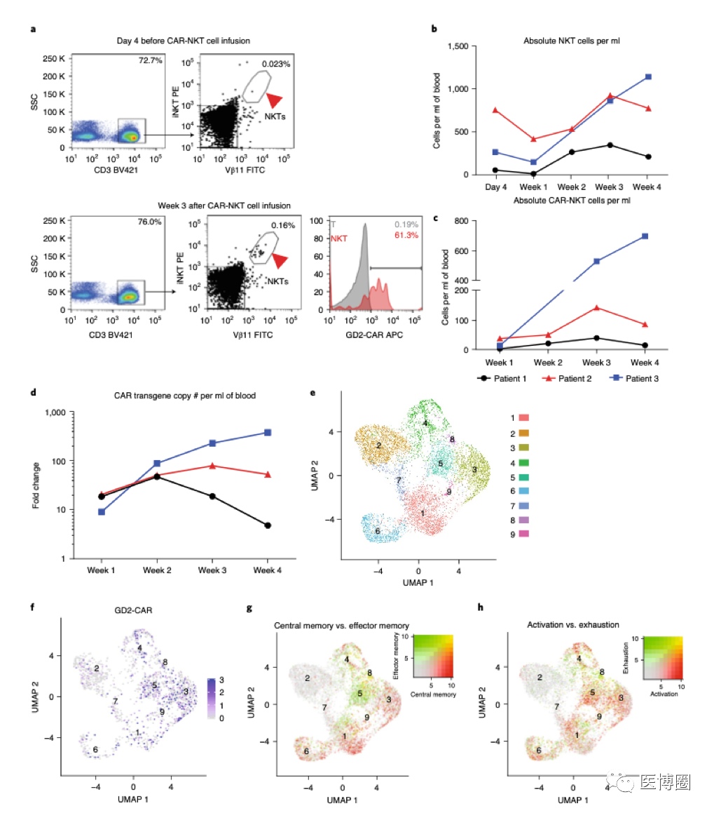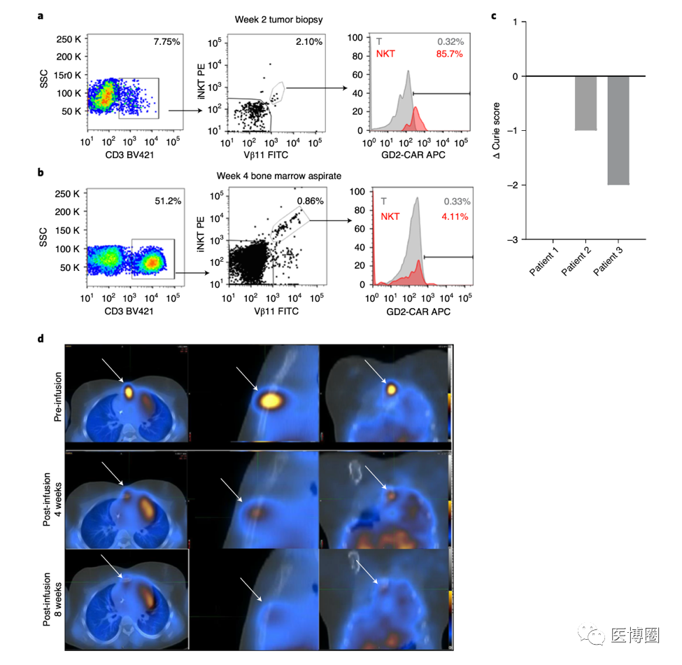 a 通過流氏細胞檢測技術,病人3在輸入NKT細胞之前,之后的NKT細胞的比例,以及周邊血樣本GD2-CAR的表達。在輸入NKT細胞4天前的CAR-NKT細胞比例是0.023%,輸入CAR-NKT細胞3個星期之后,NKT細胞比例提升到了0.16%。柱形圖展現(xiàn)了在輸入NKT細胞三個星期之后,CAR的表達(紅色,61.3%)和陰性對照(灰色,0.19%)相比。