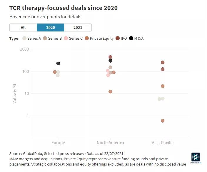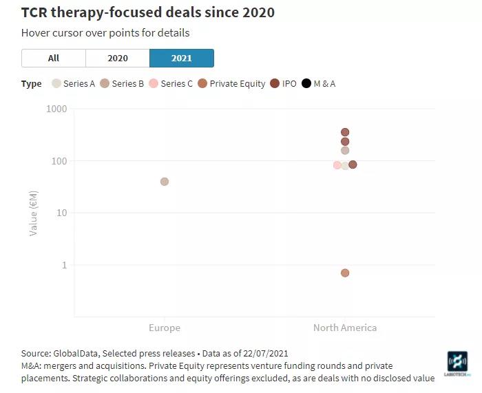 然而在2021年上半年,歐洲卻很少有開(kāi)發(fā)商對(duì)TCR-T進(jìn)行風(fēng)險(xiǎn)投資,同樣在亞洲也是如此。但是這一現(xiàn)象與美國(guó)形成鮮明對(duì)比,美國(guó)至少獲得了三輪由TCR-T公司的籌集的風(fēng)險(xiǎn)投資,并且TCR-T開(kāi)發(fā)商在美國(guó)也進(jìn)行了多次首次公開(kāi)募股。最近一次是TScan Therapeutics以8500萬(wàn)歐元的價(jià)格完成資金募集。